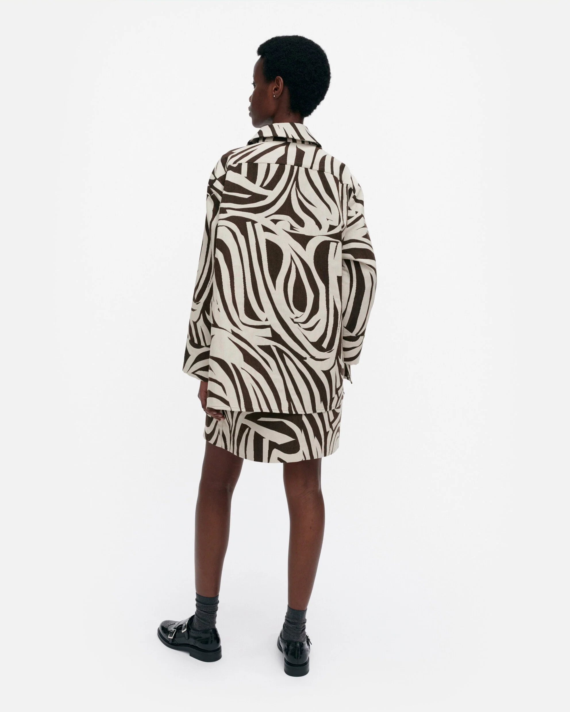 The Rakenne overshirt is made of a cotton blend and it has an oversized, A-line fit. The overshirt features the jacquard knit Jokuraita pattern, and it has a pointed collar, a button closure, and one chest pocket. The cuffed sleeves have double button closures and the side seams have slits.